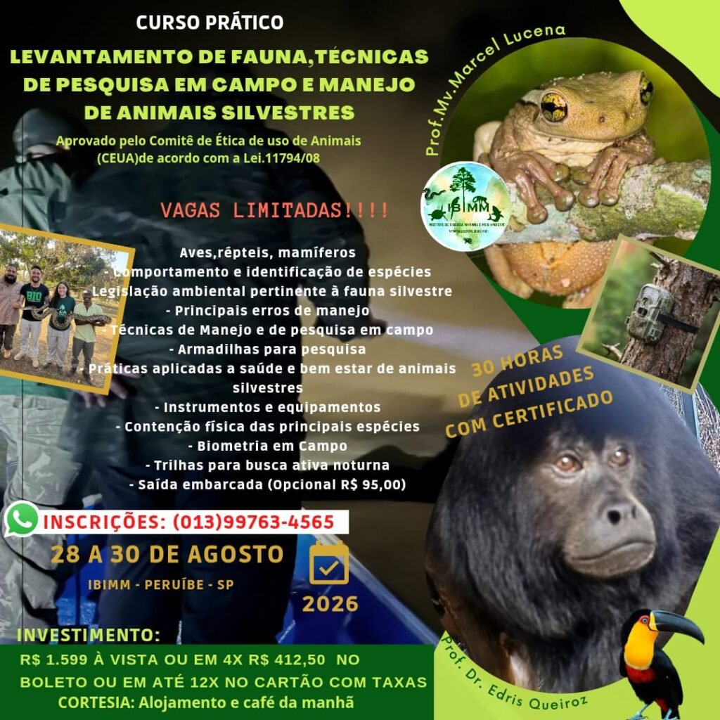 ibimmCURSOSINSCRIÇÕES ABERTAS !!!animais silvestres,biologia,BIOLOGY,fauna,FAUNABRASILEIRA,FAUNASILVESTRE,ibimm,MEDVET,VET,VETERINARIA,WILDLIFE,WILDVETVAGAS LIMITADAS!!!! 28 A 30 DE AGOSTO DE 2026. Local: IBIMM GUARAÚ, PERUÍBE-SP Conteúdo Programático:Aves,répteis, mamíferos e anfíbios Comportamento e identificação de espécies Legislação ambiental pertinente à fauna silvestre Principais erros de manejo Técnicas de Manejo e de pesquisa em campo Armadilhas para pesquisa Práticas aplicadas a saúde e bem estar de animais silvestres Instrumentos e equipamentos Contenção física das...INSTITUIÇÃO SEM FINS LUCRATIVOS FOCADA EM: EDUCAÇÃO, PESQUISAS, CONSERVAÇÃO, MEDICINA VETERINÁRIA, BIOLOGIA, TAXIDERMIA, OSTEOLOGIA E CUIDADOS DE ANIMAIS SILVESTRES TERRESTRES E MARINHOS