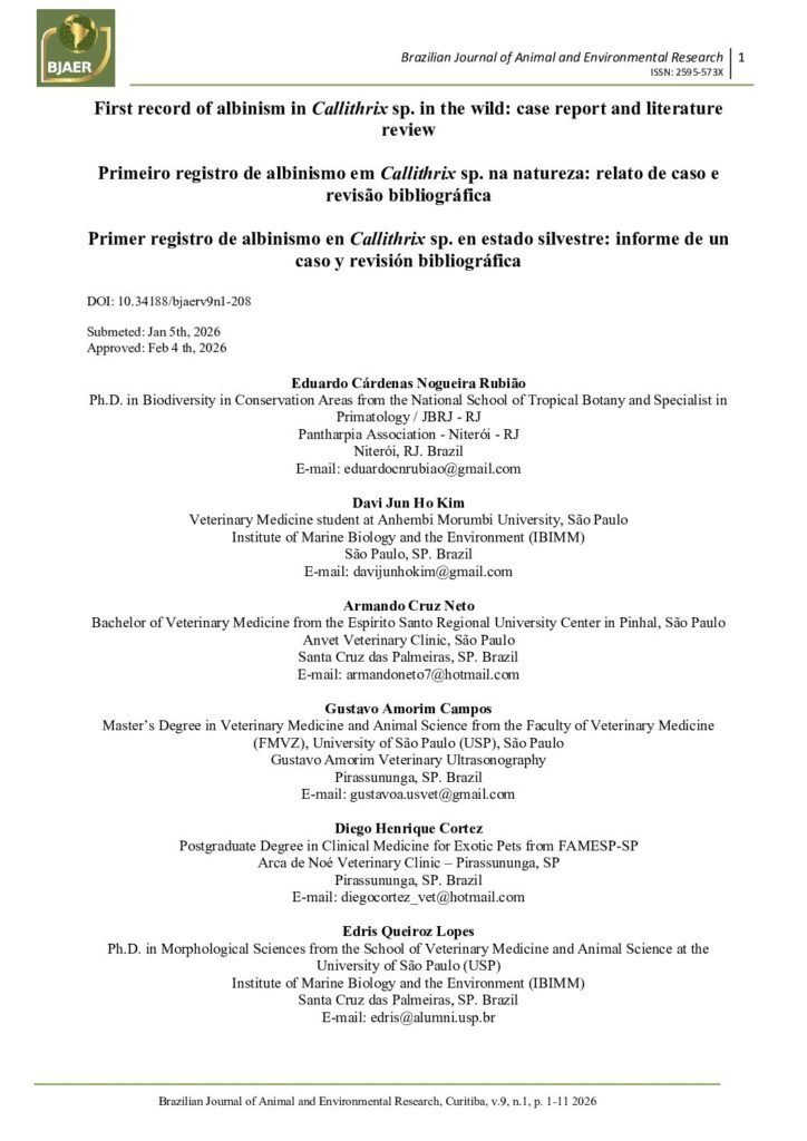 Pesquisadores do Instituto IBIMM de Peruíbe-SP, relatam o primeiro registro confirmado de albinismo em(sagui) Callithrix sp. na natureza. A pesquisa foi conduzida pelo renomado médico veterinário e primatologista Prof.Dr. Eduardo C.N.Rubiao com vasta experiência em primatas não humanos(PNH) e equipe e coordenada pelo cientista biólogo e anatomista veterinário Prof.Dr. Edris Queiroz. O artigo completo está disponível no Periódico Bjaer: DOI: 10.34188/bjaerv9n1-208